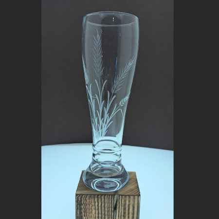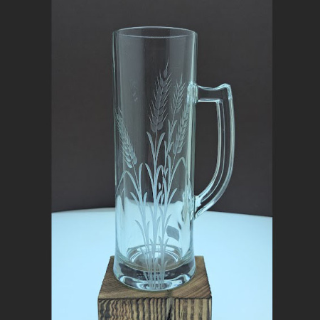 Schlanker 0,5-l Bierkrug mit handgraviertem Ährenmotiv. Matte Gravur direkt ins Glas geschnitten – griffiger Henkel, klare Linien, jedes Stück ein Unikat.