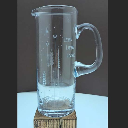 Glaskrug 1 l mit Henkel mit Ausguss, sandgestrahlt mit der Bergkette „Südberge“. Mattes Panoramamotiv direkt im Glas.