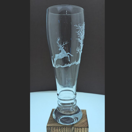 Elegantes 0,5-l Weißbierglas mit handgraviertem Hirschmotiv. Die matte Gravur wird ins Glas geschnitten – langlebig und jedes Stück ein Unikat.